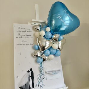 Цвет ленты и состав воздушных шаров может быть любым на ваш выбор. Все шары наполнены чистым гелием и обработаны для длительного полета.В состав входит: