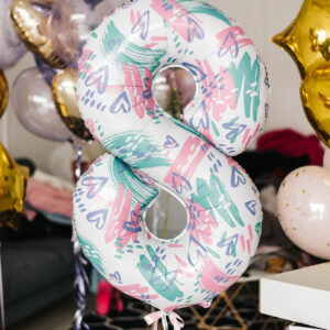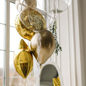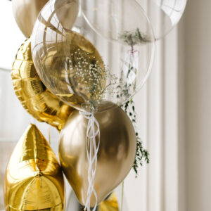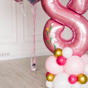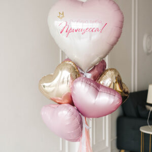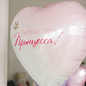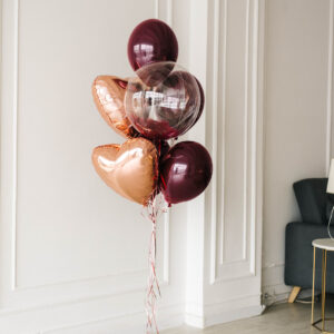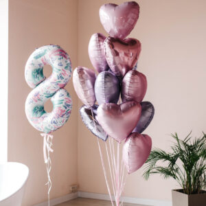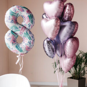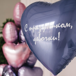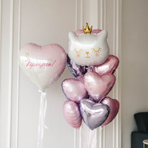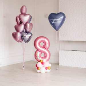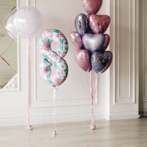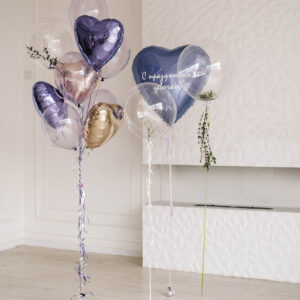 Цвет атласной ленты и состав воздушных шаров может быть любым на ваш выбор. Все шары наполнены чистым гелием и обработаны для длительного полета.