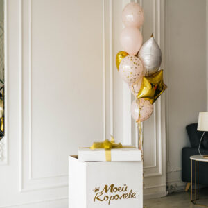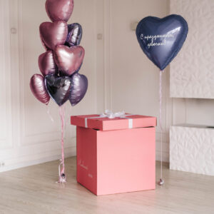 В стоимость набора входит:- Большая коробка 70х70х70 см с нанесенными поздравительными надписями