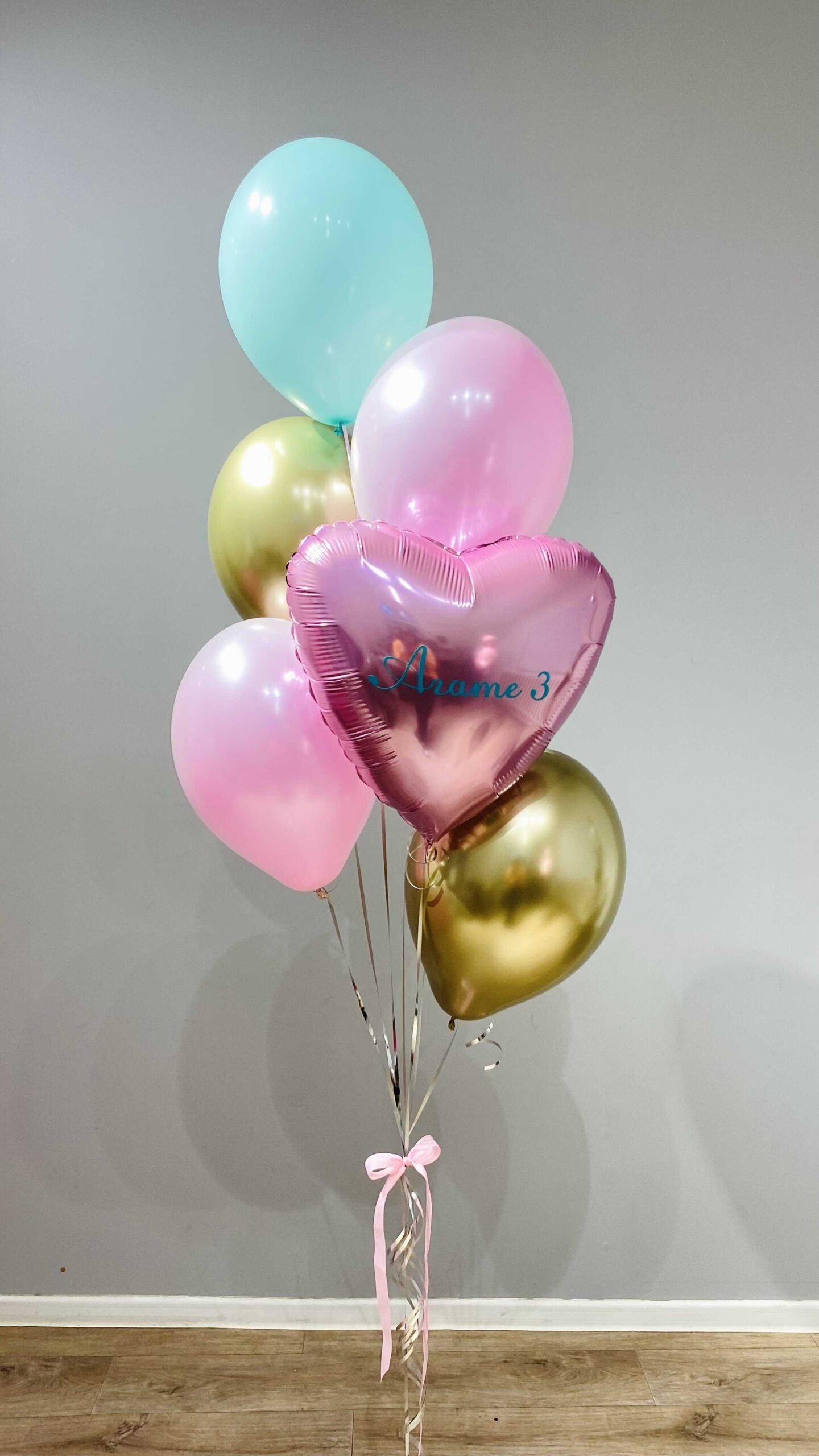 Цвет ленты и состав воздушных шаров может быть любым на ваш выбор. Все шары наполнены чистым гелием и обработаны для длительного полета.В состав входит: