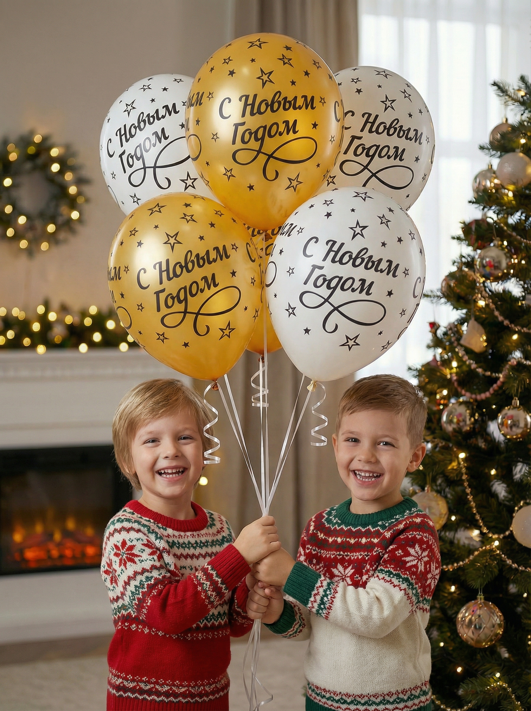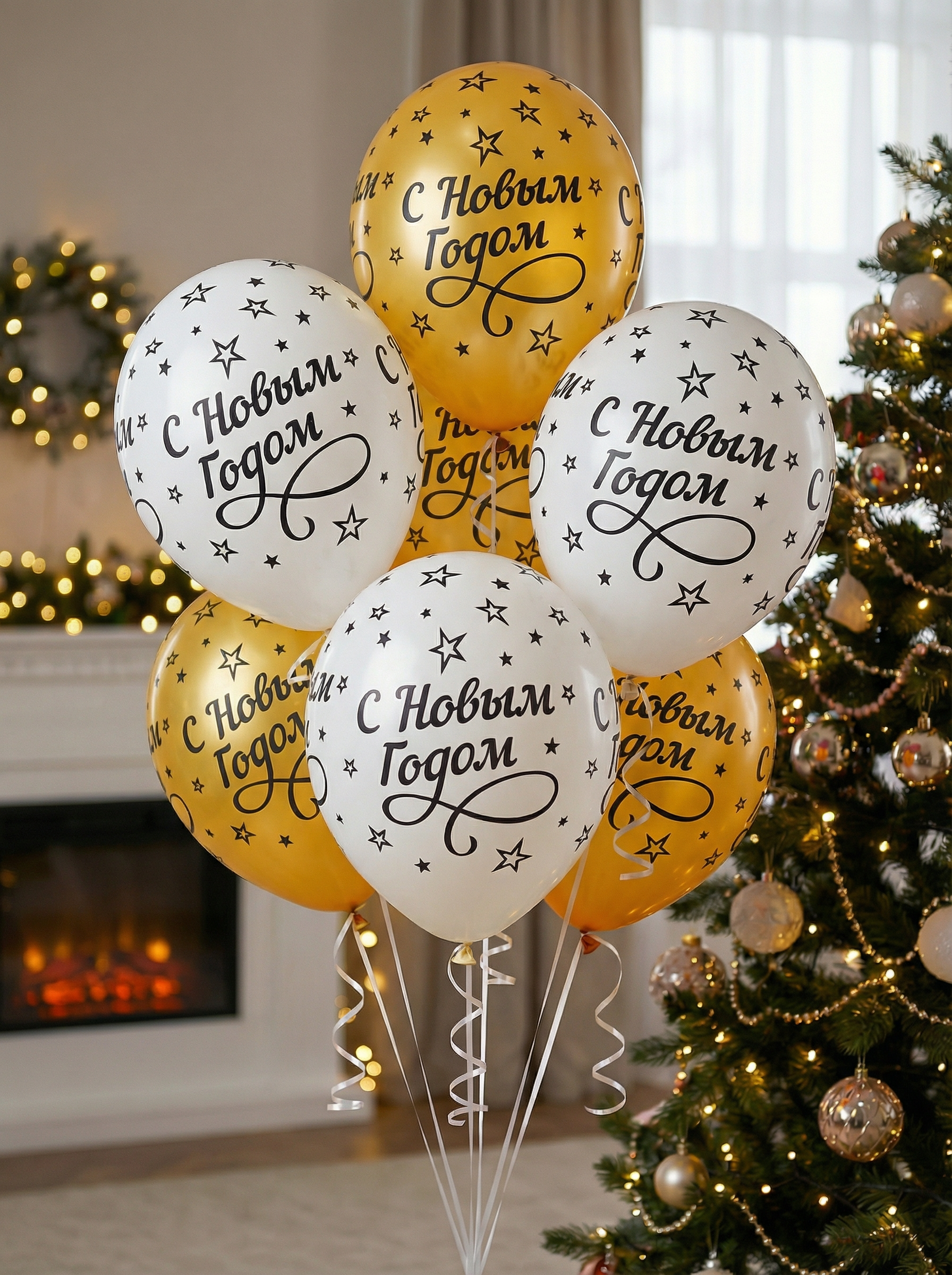 Лаконичный и стильный сет воздушных шаров для новогоднего оформления. Классическое сочетание золота и белого цвета делает этот набор универсальным решением для украшения квартиры, корпоратива или фотозоны. Крупный шрифт хорошо читается на фотографиях.